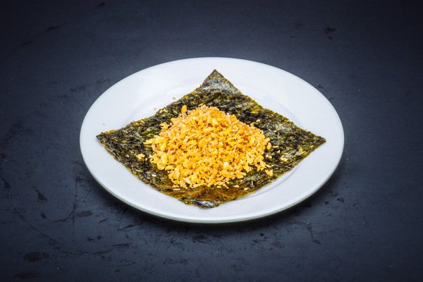 Egg yolks and egg white meringue cooked in a brass teppan to a light and fluffy finish. Sprinkled with grated parmesan cheese and Aonori (dried green seaweed).